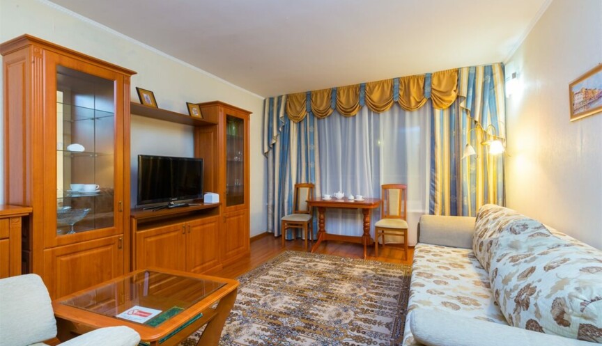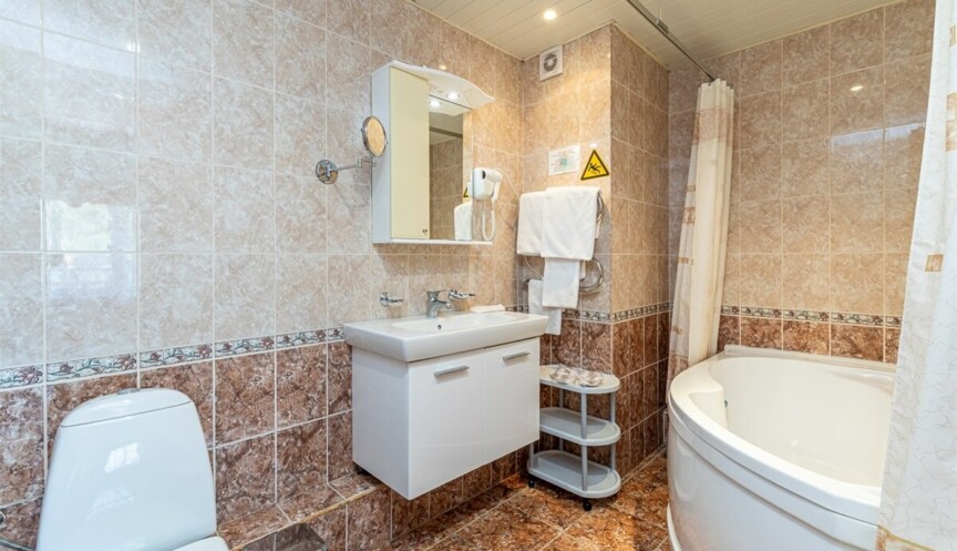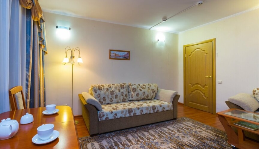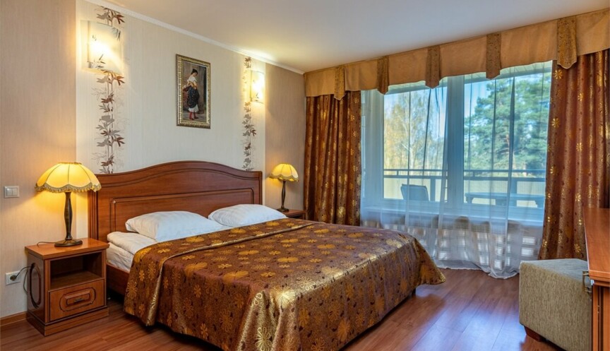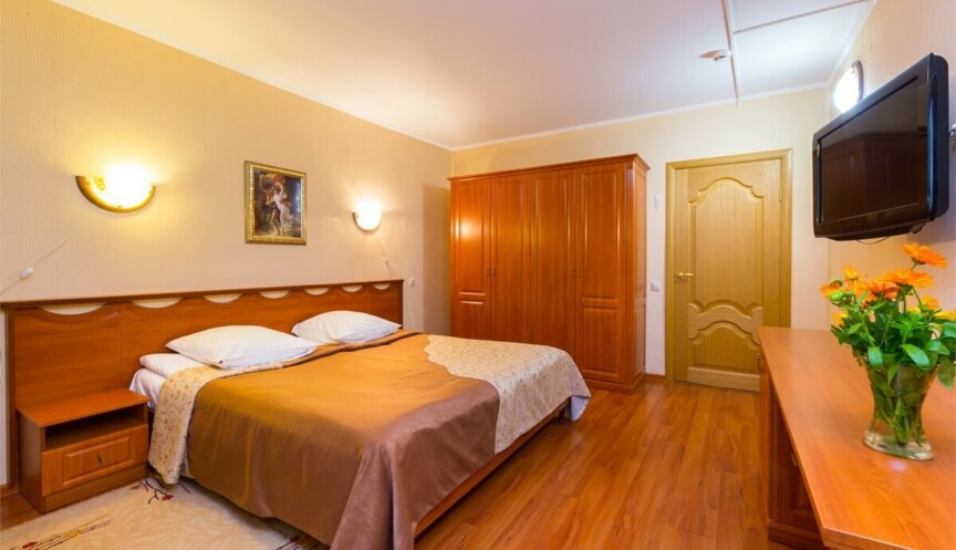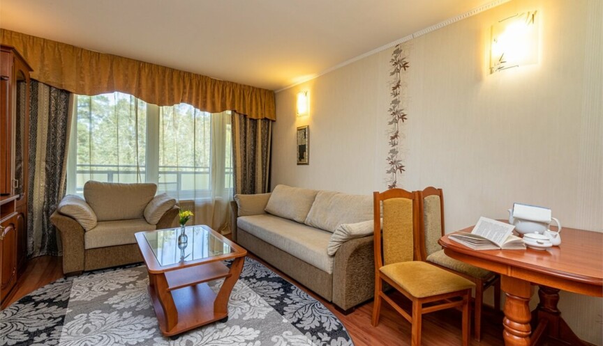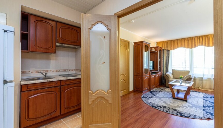 Двухкомнатный номер. Оснащение номера – двуспальная кровать, две прикроватные тумбы, диван, платяной шкаф, кресло, обеденный стол, телевизор, телефон, кухонный уголок, чайник, чайная пара, холодильник, фен, совмещённый или раздельный санузел.