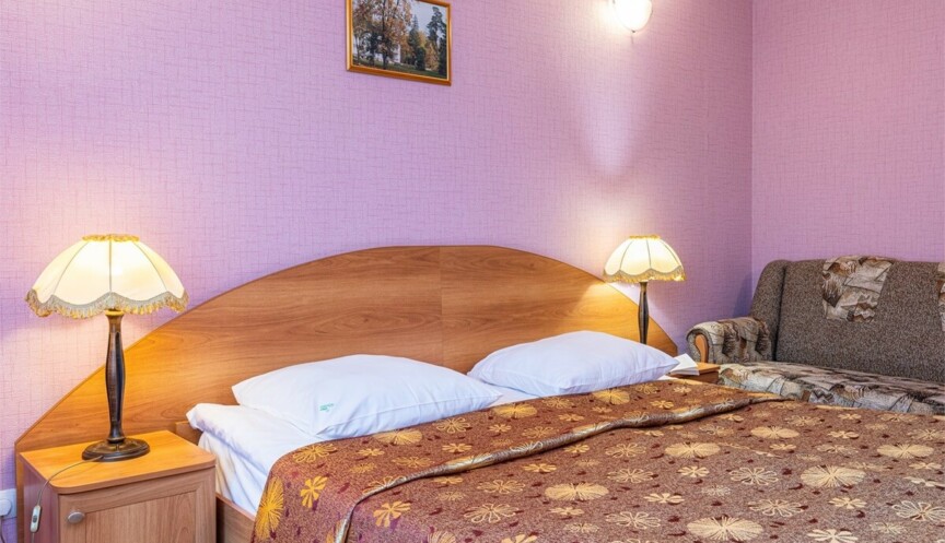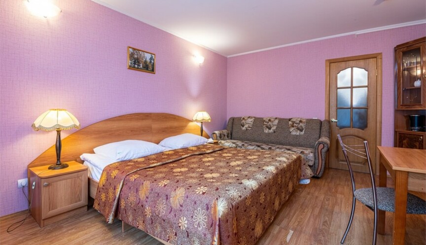 Номер для размещениях двух человек. Тип спального места – две полутороспальные кровати и диван. Оснащение номера – две полутороспальных кровати, две прикроватные тумбы, диван, платяной шкаф, обеденный стол, телевизор, телефон, чайник, чайная пара, посуда, холодильник, фен, совмещённый санузел (душевая кабина).